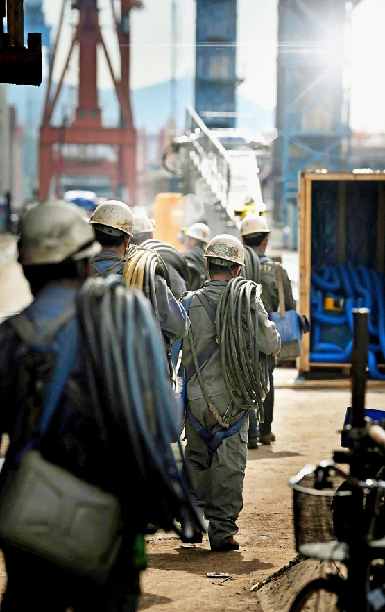 正準(zhǔn)備在 H3090 火車運輸船上搬運腳手架的李師傅。