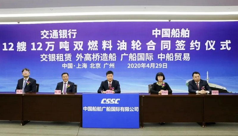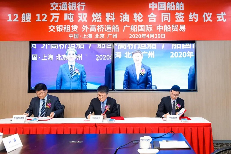 ????4月29日,中國船舶集團有限公司旗下中國船舶工業(yè)貿(mào)易有限公司、上海外高橋造船有限公司、廣船國際有限公司與交通銀行股份有限公司旗下交銀金融租賃有限責任公司在北京、上海、廣州三地以“云簽約”方式簽署12艘12萬噸雙燃料油船建造合同,合同總金額約46億元人民幣,這是中國船舶集團旗下單位近期承接的又一單筆大額訂單。中國船舶集團黨組書記、董事長雷凡培,交通銀行黨委書記、董事長任德奇,中國船舶集團黨組成員、副總經(jīng)理孫偉,交通銀行黨委委員、副行長呂家進出席簽約儀式。