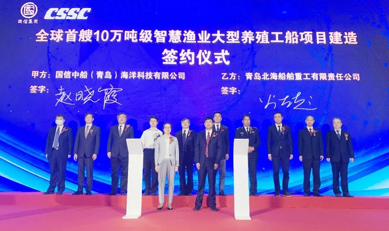 ????6月3日,中國船舶集團(tuán)有限公司旗下武船集團(tuán)青島北海船舶重工有限責(zé)任公司與國信中船(青島)海洋科技有限公司在青島西海新區(qū)正式簽署全球首艘10萬噸級(jí)智慧漁業(yè)大型養(yǎng)殖工船的建造合同。本次簽約標(biāo)志著養(yǎng)殖工船項(xiàng)目正式進(jìn)入實(shí)質(zhì)性建造階段,該船將于2022年3月交付。中國船舶集團(tuán)黨組成員、副總經(jīng)理孫偉,青島市副市長耿濤等領(lǐng)導(dǎo)和嘉賓出席簽約儀式。