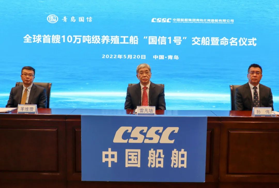 5月20日,中國(guó)船舶集團(tuán)旗下青島北海造船有限公司為青島國(guó)信發(fā)展(集團(tuán))有限責(zé)任公司建造的全球首艘10萬(wàn)噸級(jí)智慧漁業(yè)大型養(yǎng)殖工船“國(guó)信1號(hào)”交船命名儀式在青島舉行。中國(guó)船舶集團(tuán)黨組書(shū)記、董事長(zhǎng)雷凡培,黨組成員、副總經(jīng)理孫偉通過(guò)視頻出席儀式,山東省人民政府黨組成員、副省長(zhǎng)凌文,青島市委副書(shū)記、市長(zhǎng)趙豪志,中國(guó)海洋大學(xué)黨委副書(shū)記、校長(zhǎng)于志剛,中國(guó)工程院院士麥康森等領(lǐng)導(dǎo)和嘉賓出席儀式。青島市副市長(zhǎng)趙燕為新船命名。