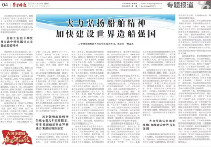 11月23日,中共中央黨校主辦的以思想理論宣傳為主旨的中央級大報《學(xué)習(xí)時報》刊發(fā)了中國船舶集團(tuán)有限公司黨組副書記、總經(jīng)理?xiàng)罱鸪墒鹈恼隆洞罅霌P(yáng)船舶精神 加快建設(shè)世界造船強(qiáng)國》。