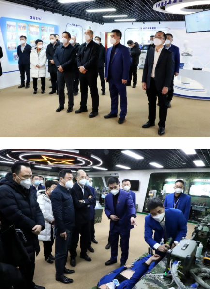 譚作鈞一行參觀了中國船舶集團(tuán)旗下中船海神醫(yī)療科技有限公司應(yīng)急醫(yī)療救援裝備展廳,觀摩了公司自主研制的便攜式通用生命支持系統(tǒng)模擬急救現(xiàn)場演示,詳細(xì)了解了有關(guān)產(chǎn)品的技術(shù)研發(fā)、性能指標(biāo)、應(yīng)用場景和生產(chǎn)保供能力等情況。