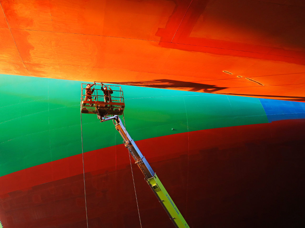 兩位打磨工人駕駛高空車對外板進行清潔施工,這個瞬間,他們?nèi)缤蒙碛谕挳斢谝话恪?