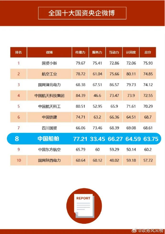 1月31日,由微博出品,人民網(wǎng)輿情數(shù)據(jù)中心、人民網(wǎng)數(shù)據(jù)研究院提供學(xué)術(shù)支持的“2023年度政務(wù)微博影響力報(bào)告”發(fā)布?!爸袊?guó)船舶”微博登上“全國(guó)十大國(guó)資央企微博”榜單,這是“中國(guó)船舶”微博第三次進(jìn)入“全國(guó)十大國(guó)資央企微博”排行榜。