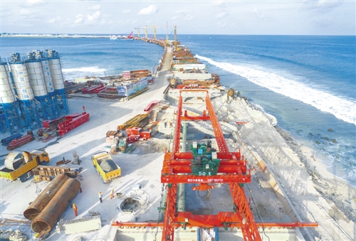 這是7月6日在馬爾代夫航拍的建設(shè)中的中馬友誼大橋。隨著主橋23號(hào)墩承臺(tái)最后一車(chē)混凝土的澆筑,中國(guó)援馬爾代夫中馬友誼大橋5個(gè)主橋承臺(tái)6日全部施工完成,標(biāo)志著占全橋施工總量約70%的主橋部分從此徹底擺脫印度洋的強(qiáng)涌浪襲擾,進(jìn)入上部結(jié)構(gòu)施工階段。