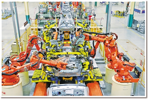 日前,記者在東風(fēng)汽車(chē)公司旗下神龍汽車(chē)公司成都工廠焊裝車(chē)間看到,占地面積約10個(gè)足球場(chǎng)的車(chē)間儼然就是一個(gè)“機(jī)器人王國(guó)”:442臺(tái)各種機(jī)器人都在忙碌著,所有點(diǎn)焊、弧焊、激光焊、螺柱焊、涂膠、包邊、鉚接、部件搬運(yùn)等“重活、累活”全部由機(jī)器人自動(dòng)完成。焊裝分廠廠長(zhǎng)孫繼勝介紹說(shuō),除442臺(tái)機(jī)器人外,車(chē)間還有另外一個(gè)“撒手锏”??六面體轉(zhuǎn)臺(tái)設(shè)備?!霸瓉?lái)生產(chǎn)1個(gè)車(chē)型要建6條生產(chǎn)線(xiàn),現(xiàn)在1條生產(chǎn)線(xiàn)就可以生產(chǎn)6種車(chē)型?!睂O繼勝說(shuō)。