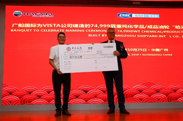 10月25日,廣船國際有限公司為VISTA公司建造的7.5萬噸化學(xué)品/成品油船4號船命名交付。這是廣船國際在“決戰(zhàn)120天,掀起生產(chǎn)高潮”勞動競賽中收獲的又一枚勝利果實。該船比合同交船期提前43天交付,船東為此專門獎勵廣船國際1萬美元。