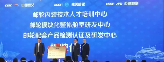 ????為解決我國(guó)郵輪配套產(chǎn)品認(rèn)證難、艙室系統(tǒng)技術(shù)水平落后、專業(yè)人才匱乏等問(wèn)題,在中船郵輪和中國(guó)船舶集團(tuán)所屬中船九江海洋裝備(集團(tuán))有限公司的指導(dǎo)下,中國(guó)船舶集團(tuán)所屬中船集艾郵輪科技發(fā)展(上海)有限公司聯(lián)合中國(guó)船級(jí)社和上海工程技術(shù)大學(xué)成立了《郵輪配套產(chǎn)品測(cè)試認(rèn)證及研發(fā)中心》、《郵輪模塊化整體艙室研發(fā)中心》和《郵輪內(nèi)裝技術(shù)人才培訓(xùn)中心》,并在會(huì)上正式揭牌。