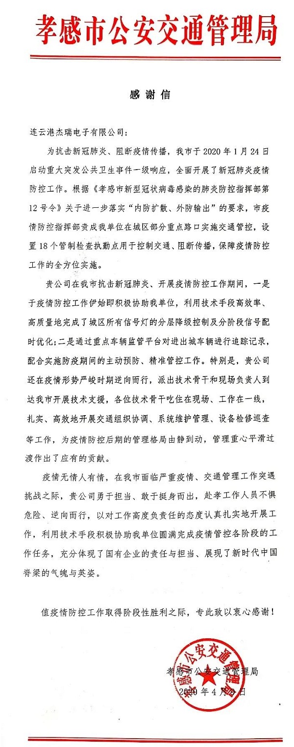 ????中國船舶集團七一六所下屬杰瑞電子公司收到湖北省孝感市公安交通管理局發(fā)來的感謝信,對杰瑞電子赴孝感工作人員不懼危險、逆向而行,以高度負責任的態(tài)度,利用技術(shù)手段,積極協(xié)助疫情防控工作表示感謝。