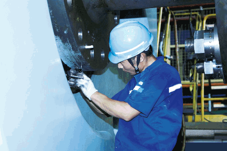 上海船院質(zhì)量檢測工程師正在檢測扭曲舵套筒。該扭曲舵由上海船院研發(fā)設計,將用于黃埔文沖在建的2700TEU集裝箱船。