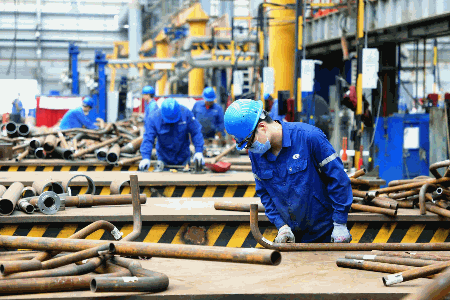 廣船國際首個吸力筒導管架風機基礎施工現(xiàn)場,技術工人正在進行管子焊接作業(yè)。