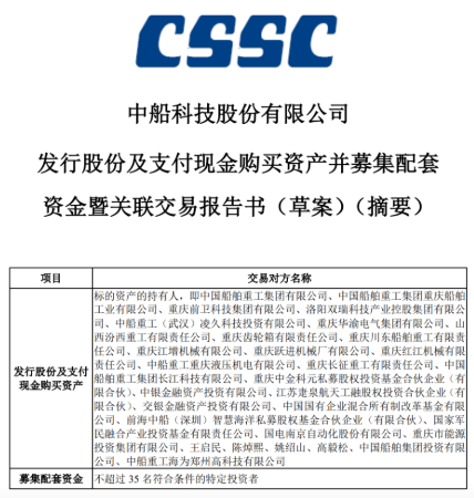 據(jù)了解,中船科技于9月30日召開了第9屆董事會第12次會議,審議通過了《發(fā)行股份及支付現(xiàn)金購買資產(chǎn)并募集配套資金暨關(guān)聯(lián)交易報(bào)告書(草案)》等相關(guān)議案。