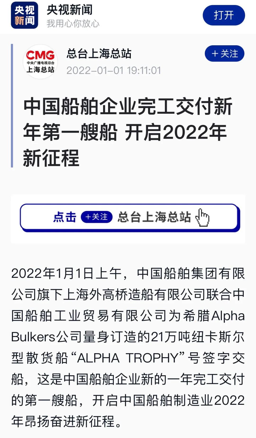 1月1日上午,中國船舶集團旗下外高橋造船聯(lián)合中船貿易建造的21萬噸紐卡斯爾型散貨船“ALPHA TROPHY”號簽字交船,這是中國船舶企業(yè)新的一年完工交付的第一艘船,開啟中國船舶制造業(yè)2022年昂揚奮進新征程。