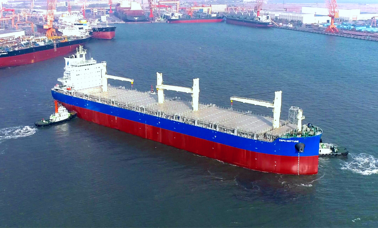 12月5日,中船集團(tuán)旗下大連造船山船重工為中信金融租賃有限公司建造的8.5萬噸多用途紙漿運(yùn)輸船5號船“海王星”號命名交付。