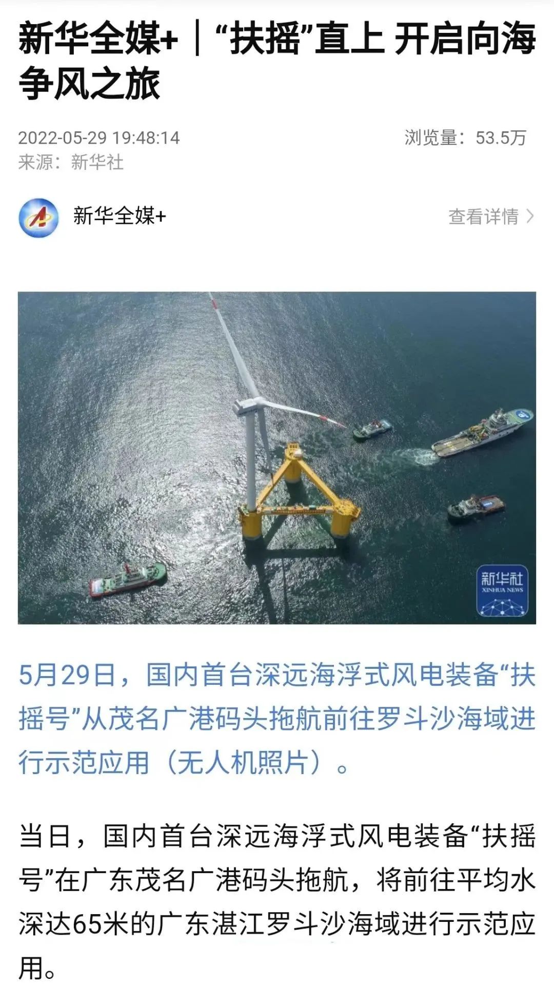 5月29日,中國(guó)船舶集團(tuán)旗下中國(guó)海裝牽頭研制的國(guó)內(nèi)首臺(tái)深遠(yuǎn)海浮式風(fēng)電裝備——“扶搖號(hào)”從廣東茂名碼頭起航,前往平均水深65米的廣東湛江附近海域投入示范應(yīng)用。