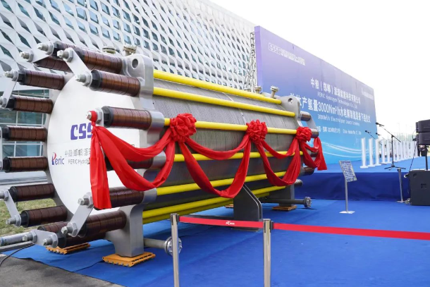 該裝備圍繞我國氫能高質(zhì)量發(fā)展重大需求,突破了大功率、高電密、寬負(fù)載、低電耗等多項前沿技術(shù),實現(xiàn)了單體產(chǎn)氫量由2000Nm3/h到3000Nm3/h的跨越,運行電流密度提升17%,槽體重量降低13%,制氫系統(tǒng)具備30%-110%的動態(tài)調(diào)節(jié)能力,能耗達(dá)到國標(biāo)一級能效標(biāo)準(zhǔn),可顯著提高單機產(chǎn)能、降低生產(chǎn)投入和運行成本,為大規(guī)模綠氫制取提供了創(chuàng)新型解決方案。