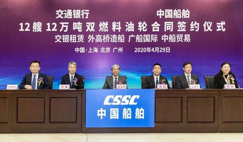 ????4月29日,中國船舶集團有限公司旗下中國船舶工業(yè)貿(mào)易有限公司、上海外高橋造船有限公司、廣船國際有限公司與交通銀行股份有限公司旗下交銀金融租賃有限責任公司在北京、上海、廣州三地以“云簽約”方式簽署12艘12萬噸雙燃料油船建造合同,合同總金額約46億元人民幣,這是中國船舶集團旗下單位近期承接的又一單筆大額訂單。中國船舶集團黨組書記、董事長雷凡培,交通銀行黨委書記、董事長任德奇,中國船舶集團黨組成員、副總經(jīng)理孫偉,交通銀行黨委委員、副行長呂家進出席簽約儀式。