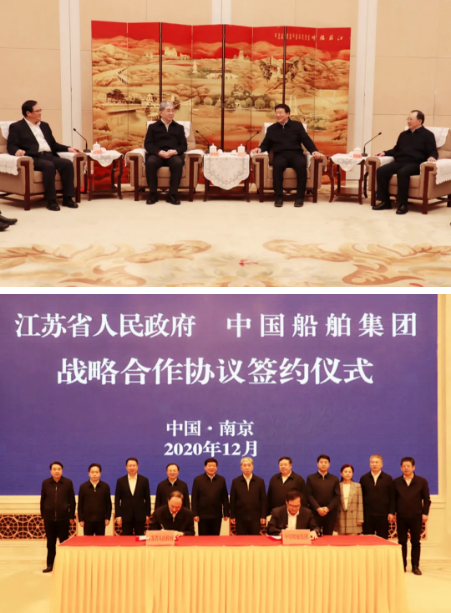 12月21日,中國(guó)船舶集團(tuán)有限公司與江蘇省人民政府在南京簽署戰(zhàn)略合作協(xié)議。中國(guó)船舶集團(tuán)黨組書(shū)記、董事長(zhǎng)雷凡培,黨組副書(shū)記、總經(jīng)理?xiàng)罱鸪?,黨組成員、副總經(jīng)理錢(qián)建平、杜剛,江蘇省委書(shū)記、省人大常委會(huì)主任婁勤儉,省委副書(shū)記、省長(zhǎng)吳政隆,省委常委、省委秘書(shū)長(zhǎng)郭元強(qiáng),副省長(zhǎng)馬秋林,省政府秘書(shū)長(zhǎng)陳建剛等領(lǐng)導(dǎo)出席簽約儀式。楊金成、馬秋林分別代表雙方在協(xié)議上簽字。簽約前,雙方圍繞共同服務(wù)國(guó)家戰(zhàn)略,就進(jìn)一步加強(qiáng)交流合作、實(shí)現(xiàn)共同發(fā)展進(jìn)行深入交流并達(dá)成共識(shí)。