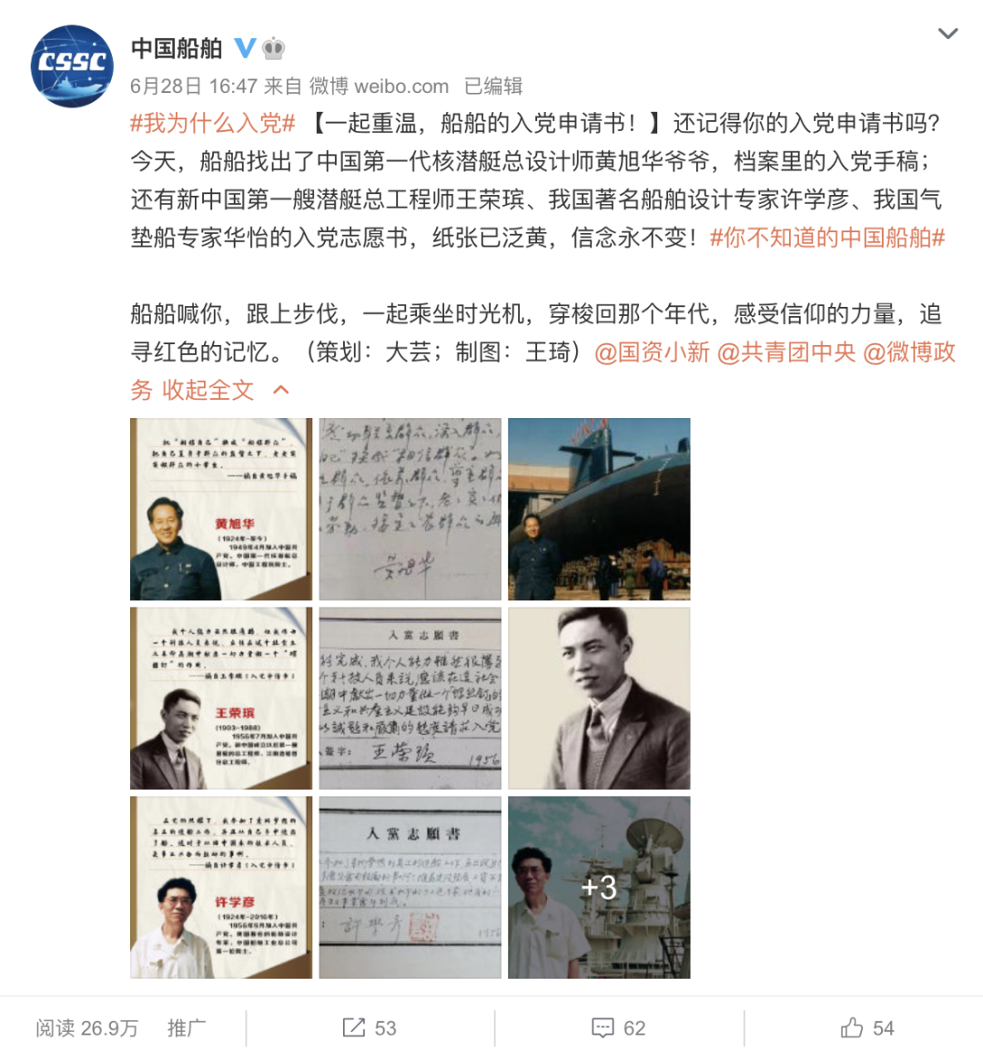 這篇微博展示了中國第一代核潛艇總設(shè)計師黃旭華、新中國第一艘潛艇總工程師王榮瑸、我國著名船舶設(shè)計專家許學(xué)彥、我國氣墊船專家華怡的親筆入黨志愿書,用一種時空穿越的方式,追尋一代人的紅色記憶,用船舶人的方式,慶祝建黨百年。