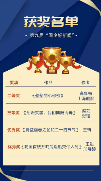 近日,第九屆“國企好新聞”獲獎作品正式揭曉,中國船舶集團(tuán)斬獲4項(xiàng)大獎,涵蓋科普類、影音類、圖片類、文字類等多種體裁。其中,二等獎1項(xiàng)、三等獎1項(xiàng)、優(yōu)秀獎2項(xiàng)。