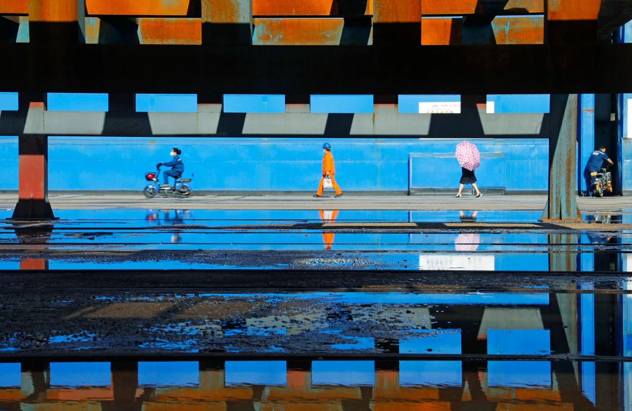 夏日清晨,一場大雨過后空氣透亮清新,廠區(qū)高跨門口服裝各異的職工行走在上班的路上,空地上擺放的工裝架與其自身的投影形成了獨特的畫框,讓畫面中行走的職工雖小卻很突出,起重工亮橙色的服裝、撐起的雨傘與明亮的藍色跨門形成色彩對比,使畫面活潑跳躍,職工們形形色色又從容有序,勾勒出廠區(qū)一隅的美麗風景。