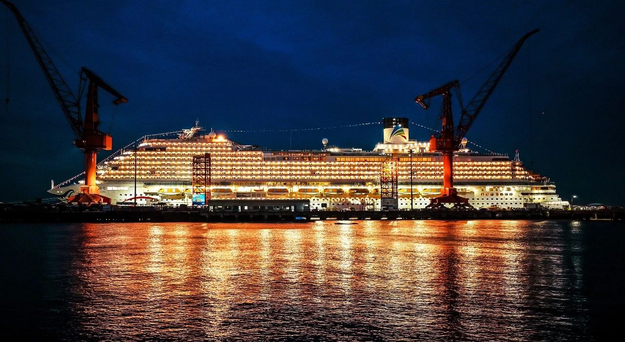 國產(chǎn)首艘國產(chǎn)大型郵輪“愛達·魔都號”,??吭陂L江口,燈光電路測試期間,華燈綻放恍如白晝。