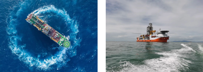 # 通過(guò)配置最先進(jìn)的DP-3級(jí)動(dòng)力定位系統(tǒng),自動(dòng)調(diào)整船舶底部7臺(tái)推進(jìn)器的轉(zhuǎn)向和推力大小,來(lái)抵抗海上風(fēng)、浪、流作用在船上的載荷,使船舶在海上保持一定的水平位置;