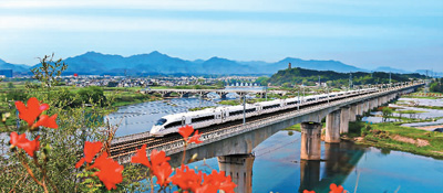 4月14日,一列動(dòng)車穿行中國最美高鐵合福線新安江休寧古城巖大橋。徐 明攝(人民視覺)