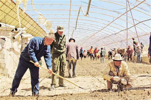 馬學(xué)濤(左一)與村民們一起在大棚種沙棘。(王 箐攝)