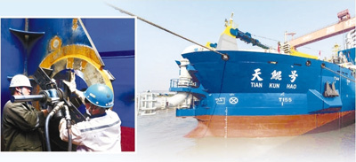 “船上鋼樁臺(tái)車安裝了4個(gè)大油缸,單個(gè)就達(dá)38噸,所有安裝誤差都只有0.2毫米”,安裝輪機(jī)車間主任沙勝紅說,“考驗(yàn)還在繼續(xù)”。輪機(jī)車間的工人全部是訓(xùn)練有素的技術(shù)員工,他們克服了難以想象的困難,硬是拿下全船高難度的設(shè)備安裝工作,質(zhì)量贏得船東、船檢的一致好評(píng)。