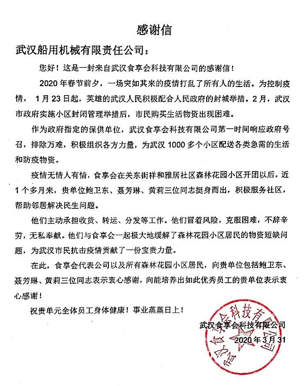 ????中國船舶集團旗下武漢船機,收到武漢食享會科技公司發(fā)來的感謝信,信中對武漢船機員工挺身而出,主動擔任武漢社區(qū)志愿者不畏艱險、無私奉獻,為抗擊疫情貢獻力量表示敬佩和感謝。
