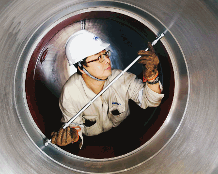 上海船院質(zhì)量檢測工程師正在檢測扭曲舵套筒。該扭曲舵由上海船院研發(fā)設計,將用于黃埔文沖在建的2700TEU集裝箱船。