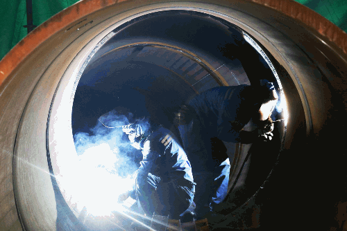 廣船國際首個吸力筒導管架風機基礎施工現(xiàn)場,技術工人正在進行管子焊接作業(yè)。