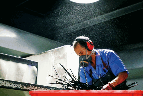 為節(jié)約成本,前衛(wèi)公司碎料工人將廢料放入廢料機,再次回收利用。
