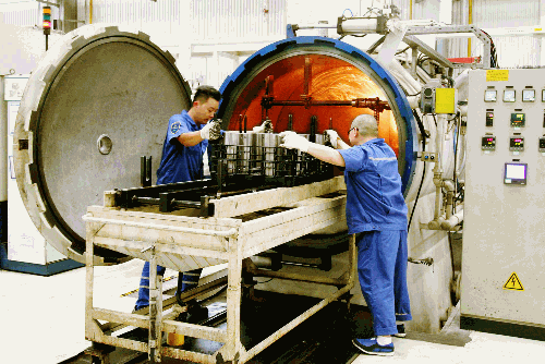 淬火的爐旁,氣溫高達50°C。重慶紅江操作師傅嫻熟地將工件從爐內(nèi)拉出,吊裝到指定工位進入下道工序,再裝上另一批產(chǎn)品入爐,繼續(xù)進行熱處理。