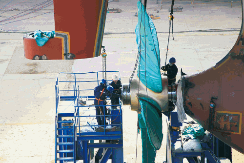 大船集團山船重工塢內(nèi)施工現(xiàn)場,鉗工正在進行螺旋槳安裝工作,為后續(xù)該船按期出塢打下基礎。
