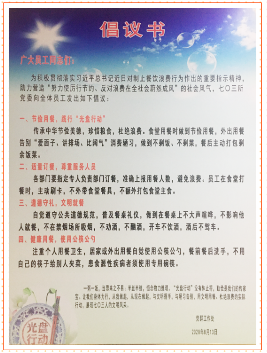 連日來(lái),中國(guó)船舶集團(tuán)多家成員單位積極踐行習(xí)近平總書記對(duì)制止餐飲浪費(fèi)行為的重要指示精神,進(jìn)一步加強(qiáng)宣傳教育,培養(yǎng)節(jié)約習(xí)慣。首先刊載有特色的宣傳海報(bào)、條幅,