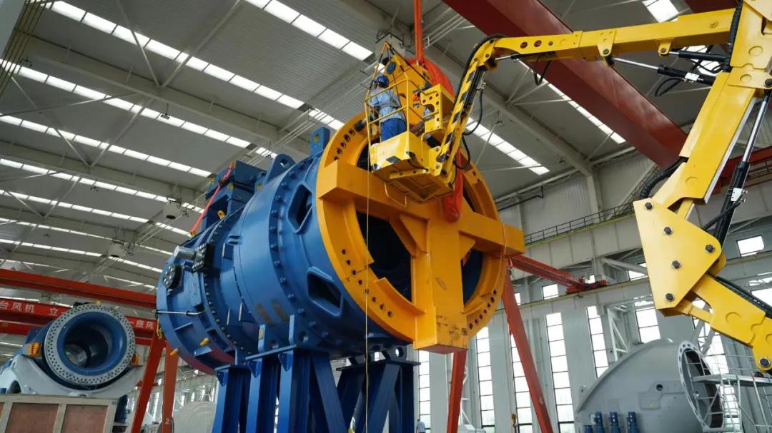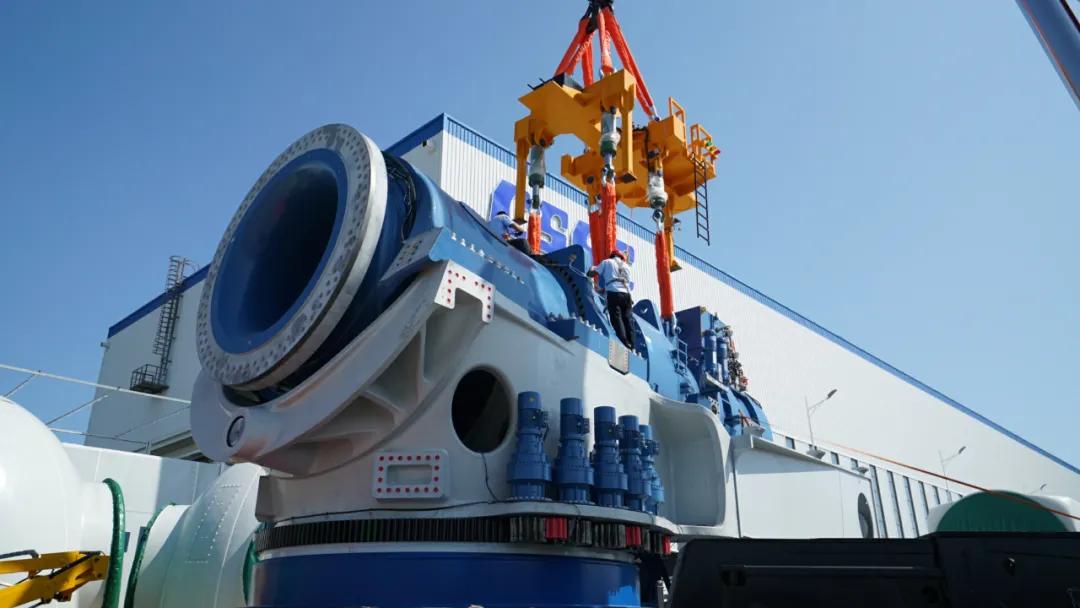 中國海裝工人在吊裝H210-10兆瓦機(jī)組傳動(dòng)鏈