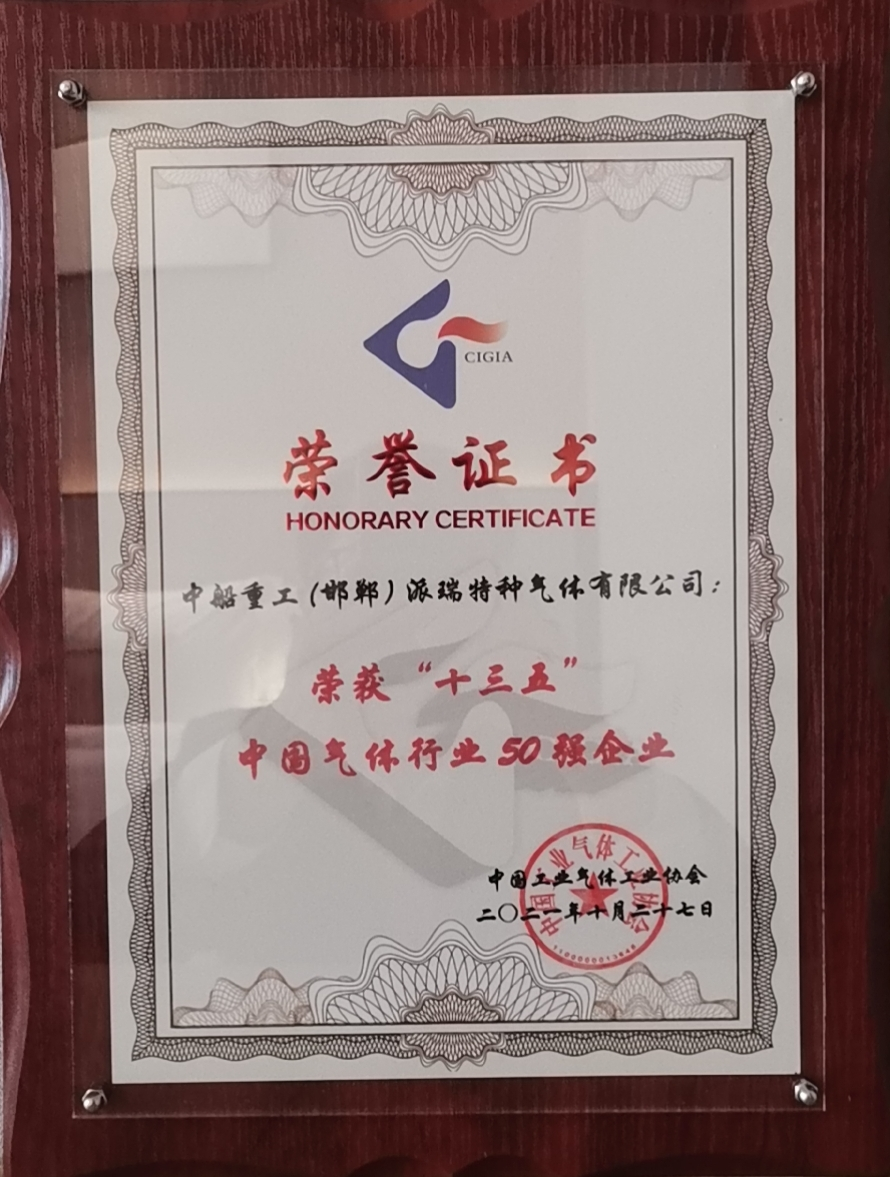 中國(guó)船舶集團(tuán)旗下七一八所所屬派瑞特氣公司,近日榮獲中國(guó)工業(yè)氣體工業(yè)協(xié)會(huì)評(píng)選的“十三五”中國(guó)氣體行業(yè)分行業(yè)電子氣體10強(qiáng)、“十三五”中國(guó)氣體行業(yè)50強(qiáng)企業(yè)榮譽(yù)稱(chēng)號(hào),以及2021年氣體行業(yè)專(zhuān)利獎(jiǎng)金獎(jiǎng)。