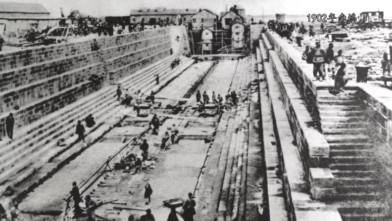 修船南塢始建于1899年,1902年底初建完工,長(zhǎng)116米、寬13米、深7.6米,采用兩開(kāi)式扉門(mén),并配備電動(dòng)排水泵。
