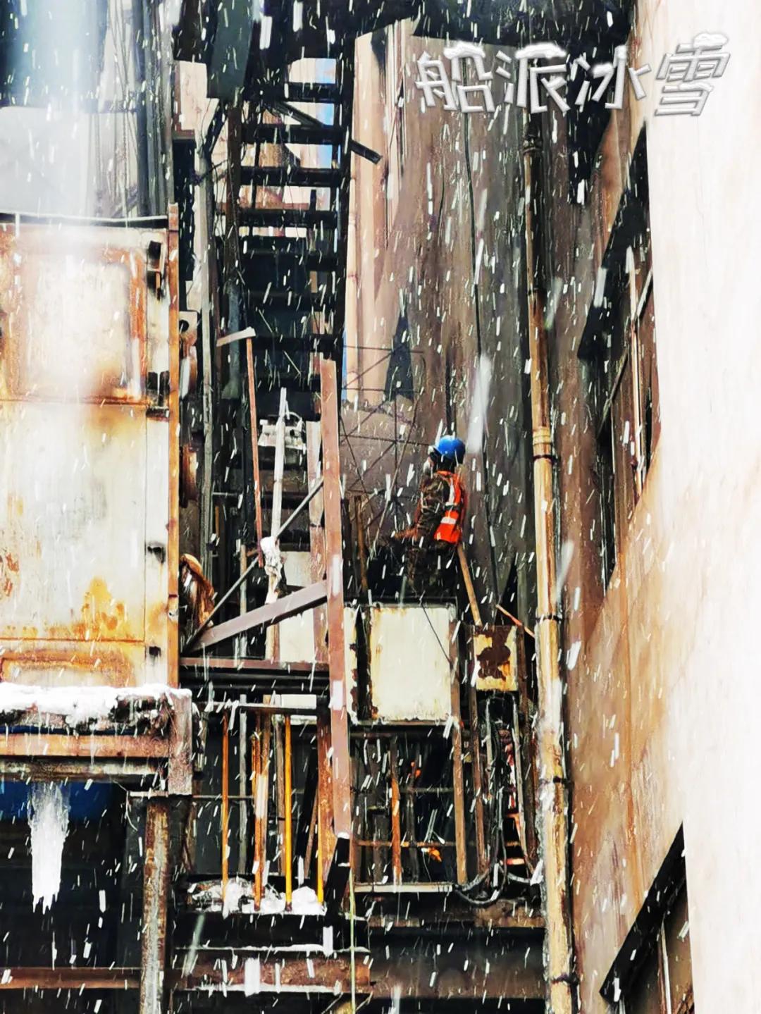 “雪花飄、北風(fēng)蕭,寒梅立雪只為船人香!”撫鋼項(xiàng)目組成員在撫順現(xiàn)場(chǎng)冒雪施工。