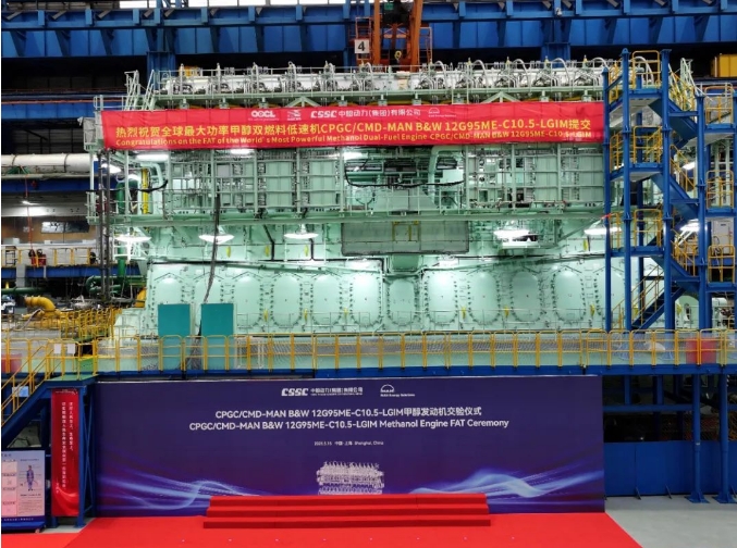 5月15日,中船集團(tuán)旗下中船動(dòng)力與MAN ES聯(lián)合舉辦的CPGC/CMD-MAN B&W 12G95ME-C10.5-LGIM-EGRTC甲醇發(fā)動(dòng)機(jī)工廠驗(yàn)收測(cè)試(FAT)交驗(yàn)儀式在中船動(dòng)力下屬中船三井成功舉行。