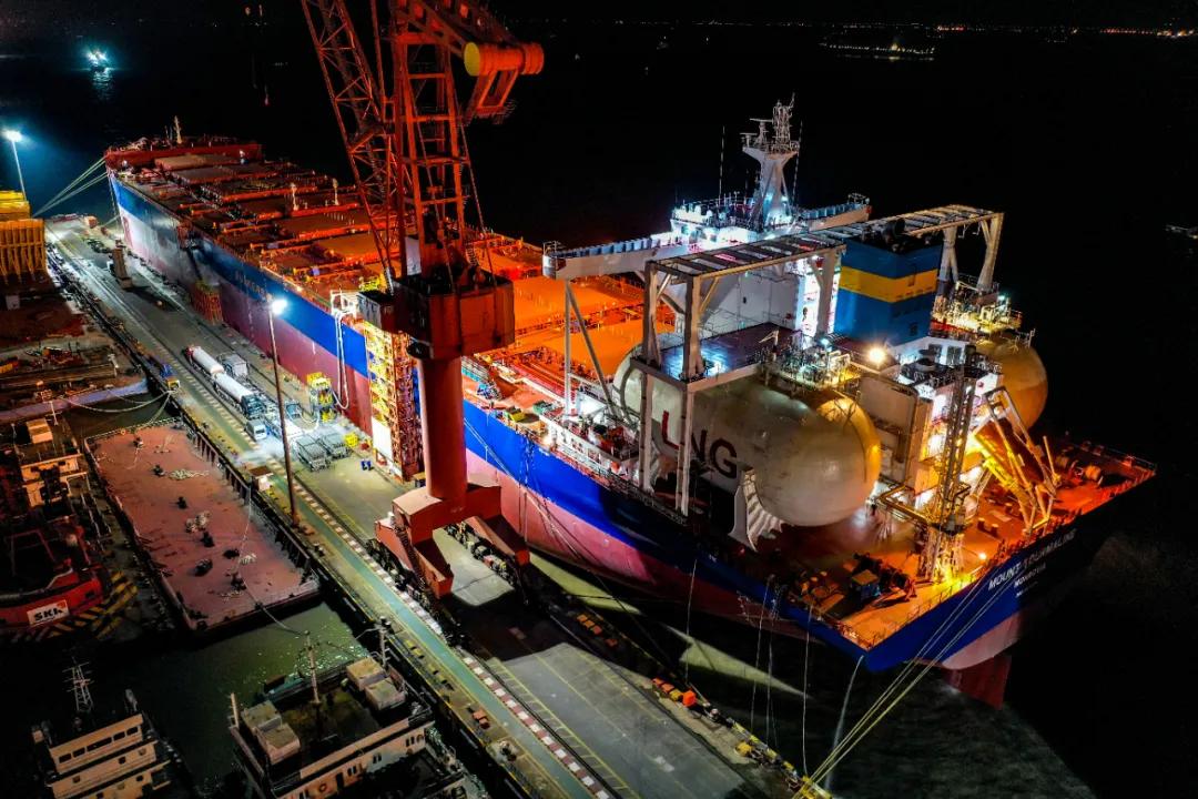 1月28日,中國(guó)船舶集團(tuán)旗下外高橋造船自主研發(fā),攜手中船貿(mào)易,為新加坡EPS公司建造的全球首艘液化天然氣(LNG)雙燃料動(dòng)力20.9萬(wàn)載重噸紐卡斯?fàn)栃蜕⒇洿?