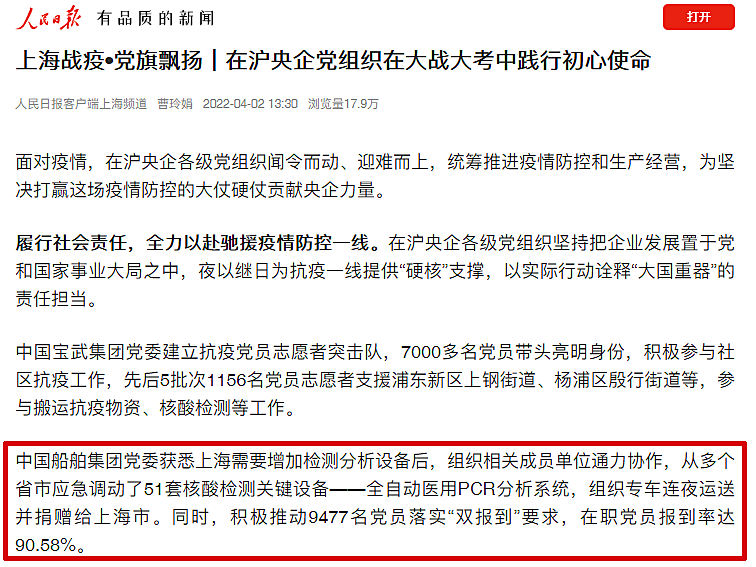 “中國船舶集團(tuán)黨組獲悉上海需要增加檢測分析設(shè)備后,組織相關(guān)成員單位通力協(xié)作,從多個省市應(yīng)急調(diào)動了51套核酸檢測關(guān)鍵設(shè)備——全自動醫(yī)用PCR分析系統(tǒng),組織專車連夜運(yùn)送并捐贈給上海市。同時,積極推動9477名黨員落實(shí)‘雙報到’要求,在職黨員報到率達(dá)90.58%?!?/p>
