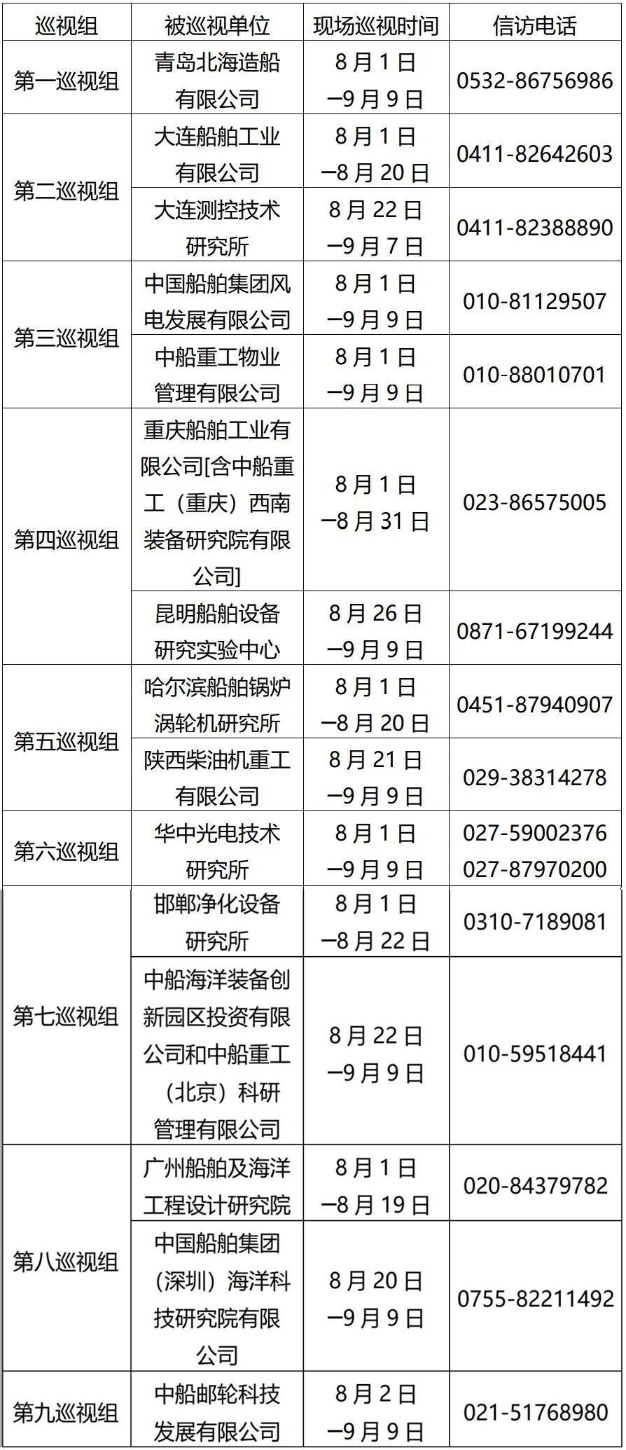 根據(jù)中國(guó)船舶集團(tuán)黨組2022年第一輪巡視工作部署,截至2022年8月2日,中國(guó)船舶集團(tuán)黨組9個(gè)巡視組已進(jìn)駐青島北海造船有限公司、大連船舶工業(yè)有限公司、中國(guó)船舶集團(tuán)風(fēng)電發(fā)展有限公司、中船重工物業(yè)管理有限公司、重慶船舶工業(yè)有限公司[含中船重工(重慶)西南裝備研究院有限公司]、哈爾濱船舶鍋爐渦輪機(jī)研究所、華中光電技術(shù)研究所、邯鄲凈化設(shè)備研究所、廣州船舶及海洋工程設(shè)計(jì)研究院、中船郵輪科技發(fā)展有限公司等單位,對(duì)其黨組織開展為期40天左右的現(xiàn)場(chǎng)巡視。巡視期間,巡視組設(shè)置專門值班電話(具體如下表)。同時(shí)在巡視組工作現(xiàn)場(chǎng)設(shè)置聯(lián)系信箱,廣大干部職工可以反映情況。