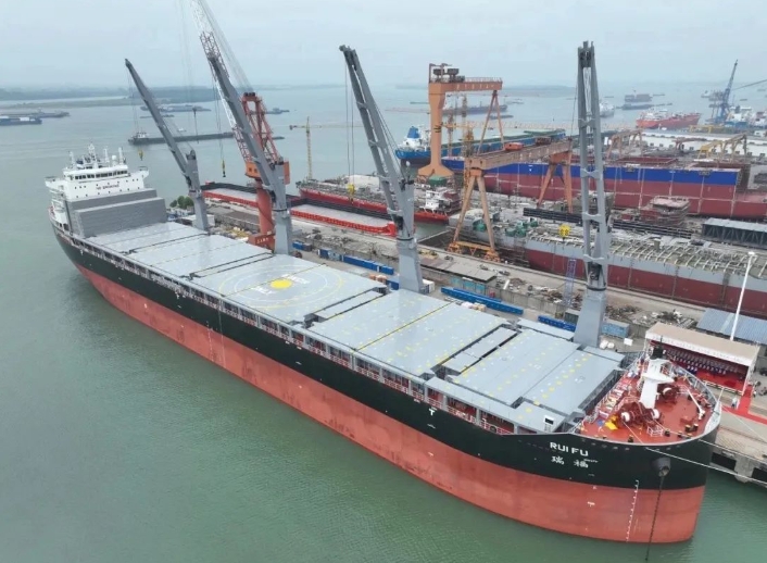“瑞?!碧?hào)是同型船的第10艘,具有裝載重大件設(shè)備貨和集裝箱式貨物的能力,首航將裝載風(fēng)電設(shè)備等貨物,并投入南非航線。