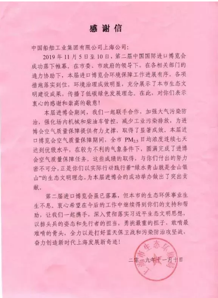 ????近日,中國船舶集團有限公司所屬中船上海船舶工業(yè)有限公司收到了一封來自上海市生態(tài)環(huán)境局的感謝信! 對中船上海地區(qū)企業(yè)在第二屆中國國際進口博覽會期間的環(huán)保管控和減排工作進行了充分肯定。
